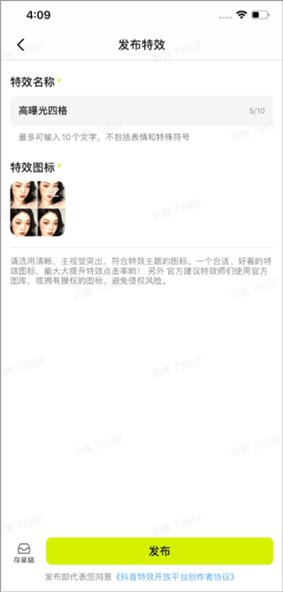 6、填写特效信息,制作特效图标,根据需要绑定对应话题,即可发布特效。