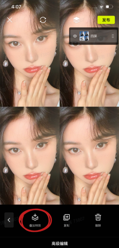 2、在【特效】中选择想要的效果。此处示意为一个常见的四格分屏效果。