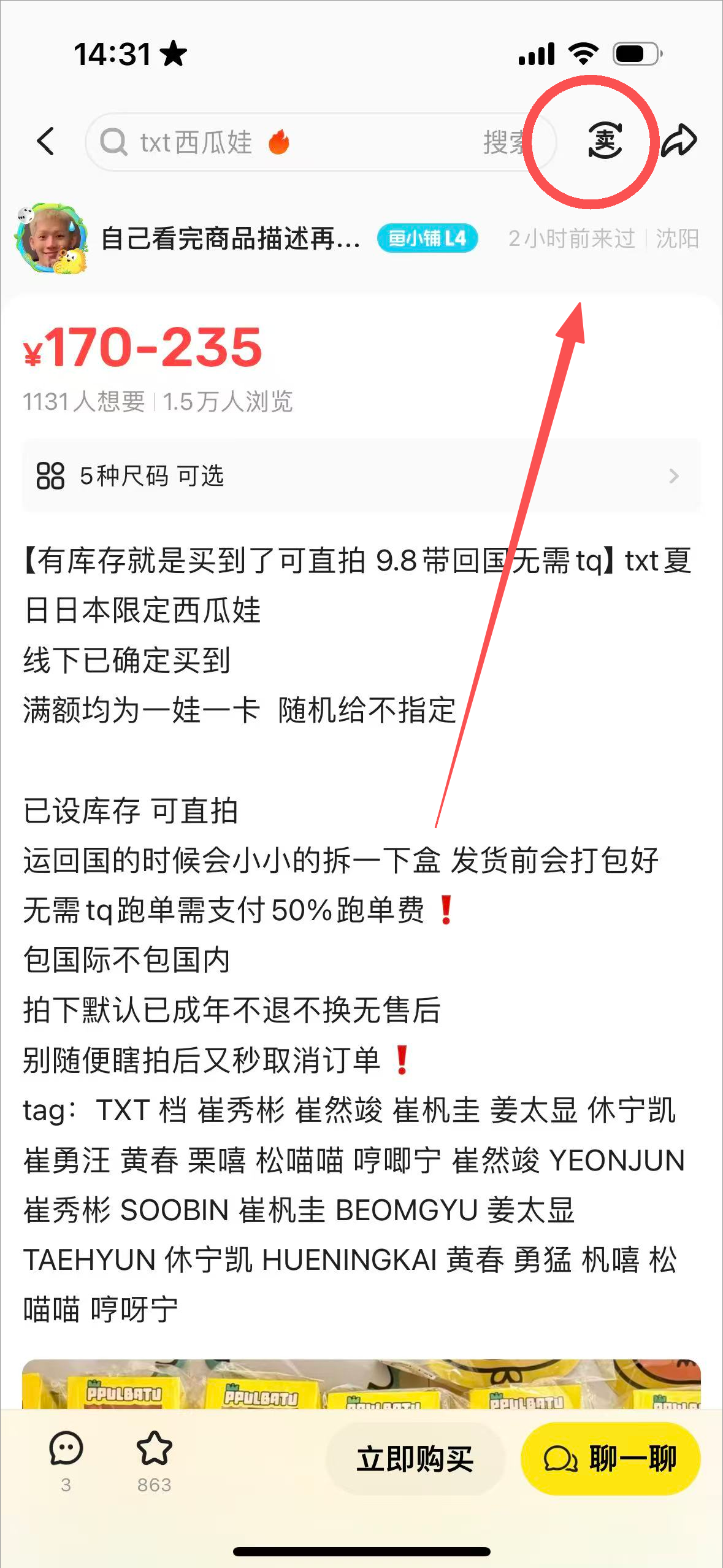6、此外,如果在主页刷到其他用户在卖自己想卖的物品可以进入购买页直接点击右上角的“卖”