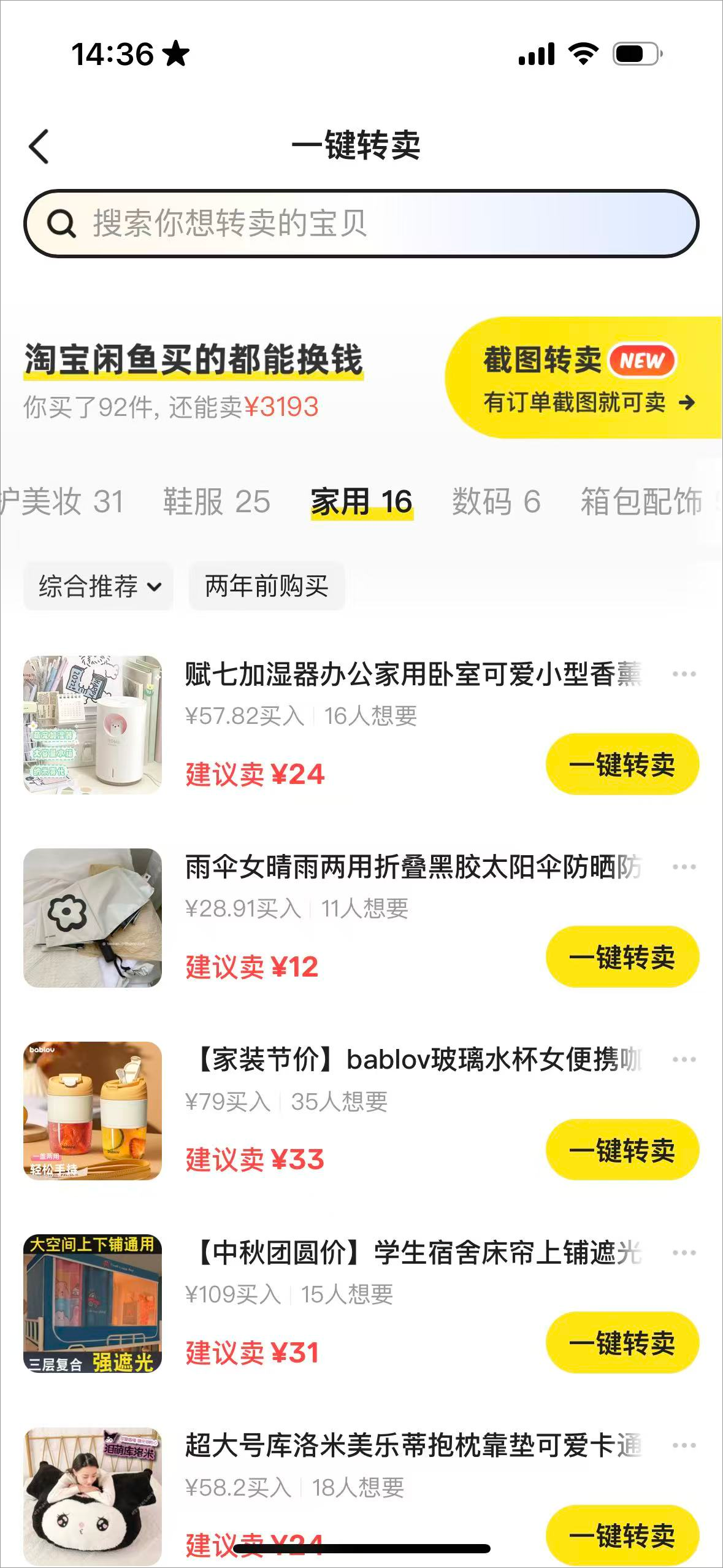 4、也可以点击发闲置下方的一键转卖,这里会同步淘宝的购买记录点击想转卖的物品