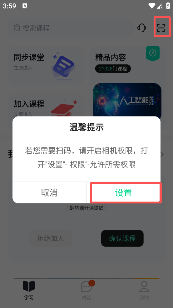 1、打开app点击最上方搜索框旁边的扫一扫打开相机权限,扫描班主任提供的二维码可以一键加入班级