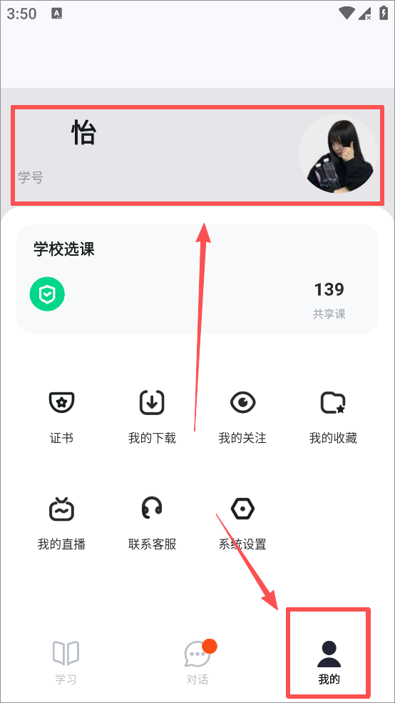 1、打开知到app官方最新版后点击“我的”进入个人主页,接着点击头像学号部分,进入个人资料页面