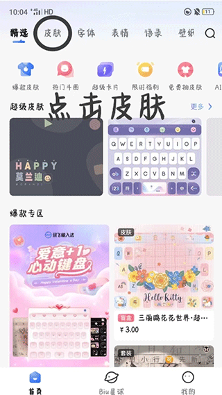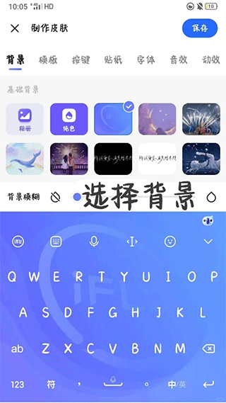 3、可以依次按照背景、按键、贴纸、字体、音效的顺序逐渐丰富自己的键盘啦!