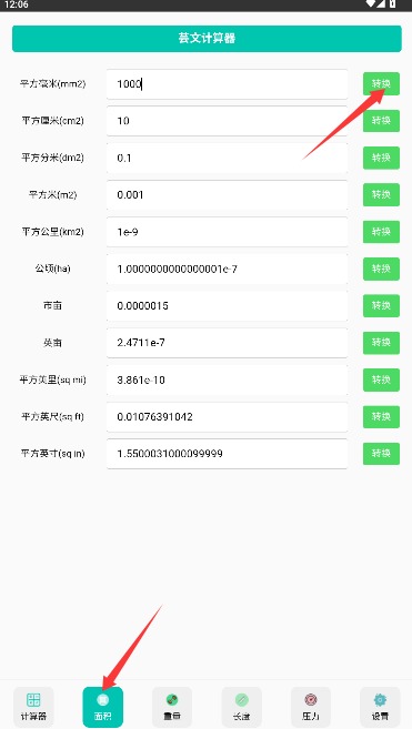 3、切换至面积换算界面,输入原始数值后点击转换按钮即可获取多单位换算结果。