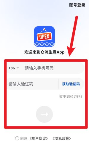 1、打开众流生意App后,输入正确的手机号码与验证码,即可快速完成账号登录操作。