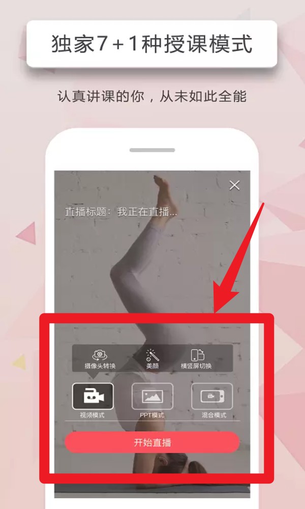 3. 开始直播授课时,可选择视频、PPT 或混合模式,支持美颜与摄像头切换。