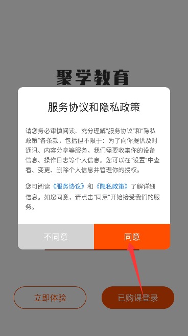 1、打开应用后仔细阅读服务协议和隐私政策,确认后点击同意按钮进入应用。