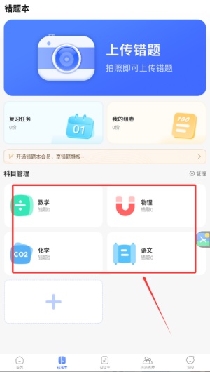 1、打开APP,在错题管理页面点击“上传错题”按钮,拍照即可保存错题内容并同步云端进行整理。