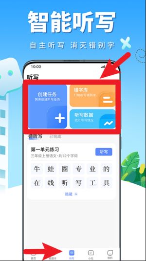 2、在智能听写界面点击“创建任务”或“错字库”,可自由生成听写练习并追踪学习数据。