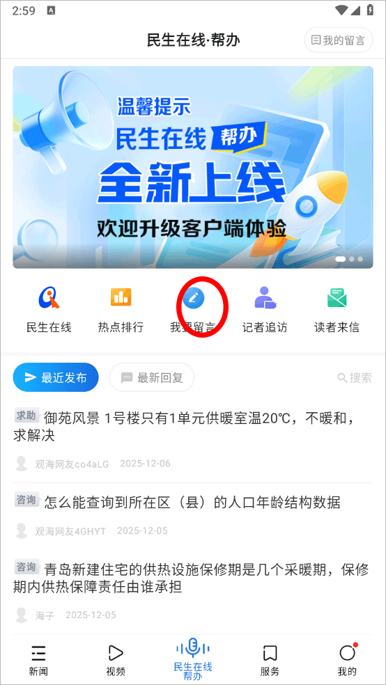 2、进入民生在线帮办页面点击我要留言
