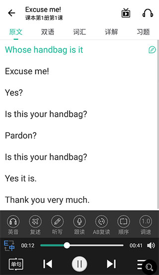 6、课程页游原文和双语两种模式切换,底部还可以选择“复述”、“听写”以及“调速”等快捷功能,帮助你根据自己的学习需要来调整。