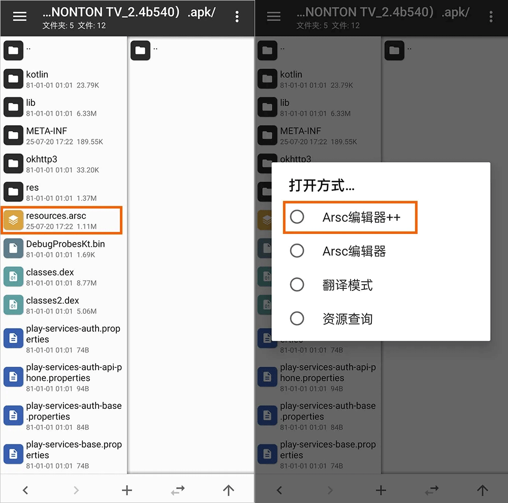 1、使用MT打开APK,点击查看;选择resources.arsc文件,打开方式Arsc编辑器++