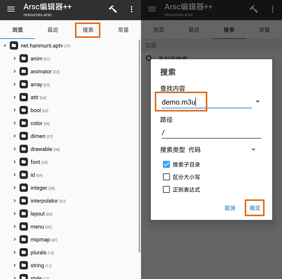 2、使用"搜索"功能,"发起新搜索"查找相应内容,搜索内容"demo.m3u"