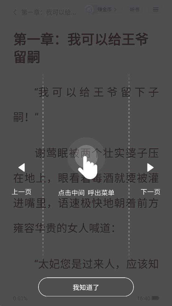 进入书籍阅读页,点击屏幕中央即可唤起菜单,点击目录图标后上下滑动,可查看当前书籍全部章节目录。