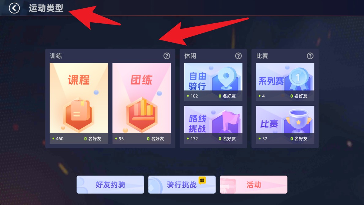 2. 在“运动类型”页面,根据个人需求选择不同骑行模式,包括训练类(课程、团练)、休闲类(自由骑行、路线挑战)及赛事类(系列赛、比赛)等,满足多样化骑行体验。