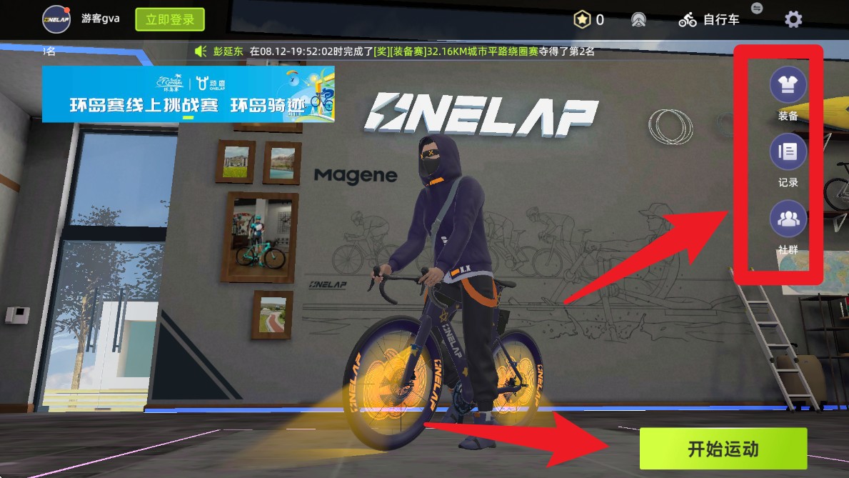 1. 进入主界面后,可在右侧功能栏中选择“装备”、“记录”或“社群”查看当前骑行装备搭配、历史骑行数据以及参与社群互动;点击底部“开始运动”按钮,进入运动模式选择页面。