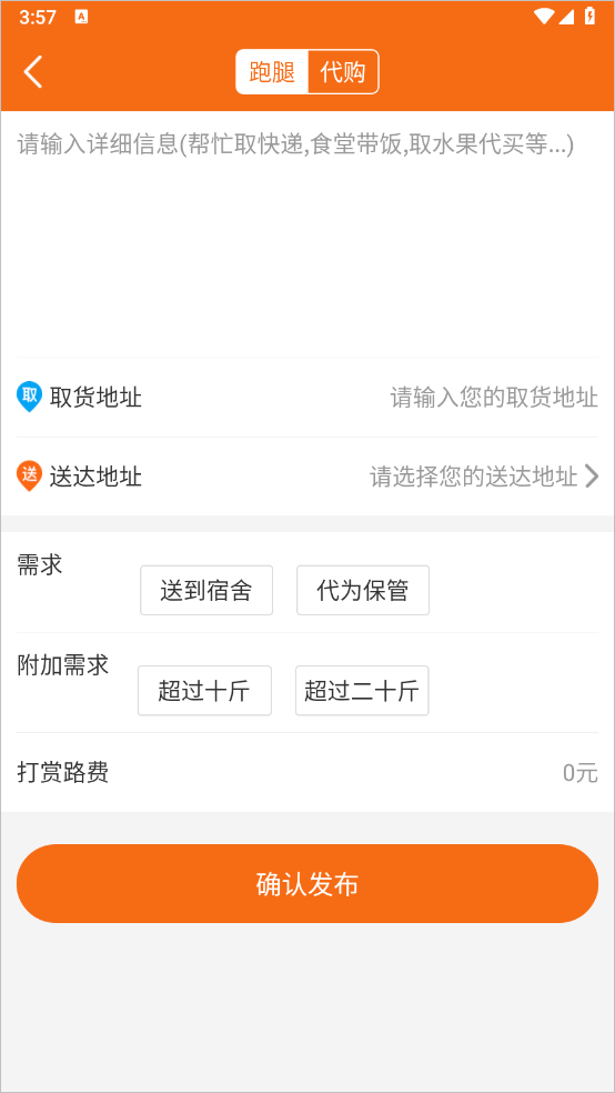 4、选择跑腿/代购输入详情信息、地址、需求等点击确认发布即可
