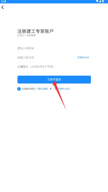 3、根据提示输入手机号码、短信验证码并设置登录密码,点击注册并登录完成验证。