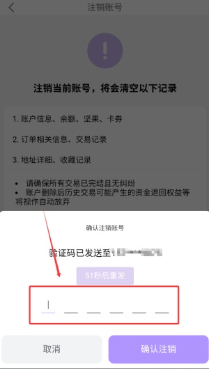 4、根据系统要求输入收到的验证码,完成验证后即可提交并注销账户。