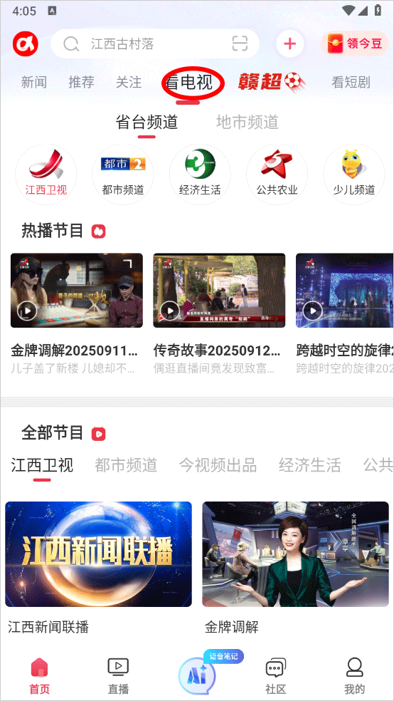 1、打开今视频app官方最新版进入首页点击【看电视】栏目;