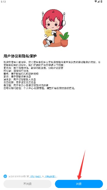 1、打开应用后仔细阅读用户协议和隐私政策,确认后点击同意按钮进入应用。