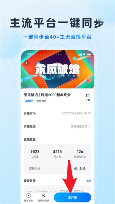 4、直播信息设置完成后,点击“去开播”按钮,一键同步至多个主流平台。