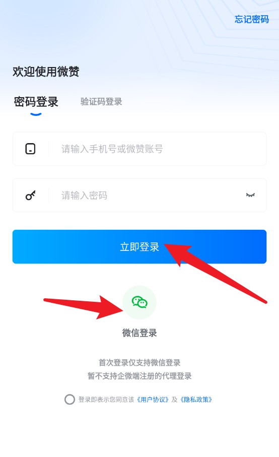 1、打开应用后可选择密码登录或微信登录,首次使用推荐微信快速登录更为便捷。