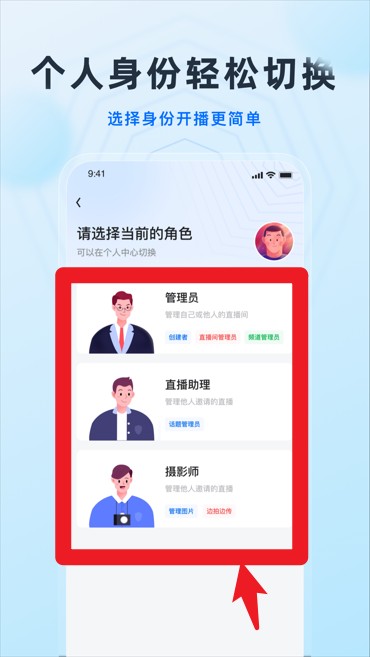 5、进入身份选择界面,根据需求选择管理员、直播助理或摄影师身份灵活切换。