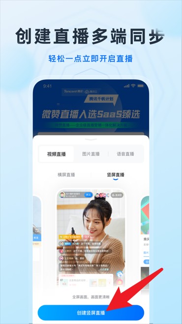 3、点击“创建竖屏直播”按钮,选择直播类型后可立即进入直播准备界面。