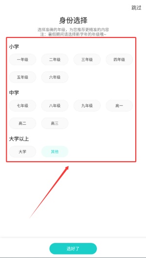 2、在新用户引导页,根据实际情况选择您当前就读的年级阶段。