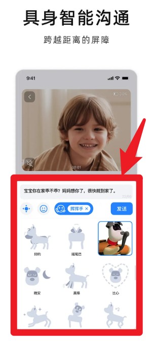 3、具身智能沟通功能可远程选择动作与语音,通过拟人形象与孩子互动,实现跨地域实时陪伴与安抚。