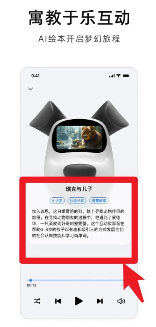 2、进入首页可通过AI绘本进行互动式故事播放,如“瑞克与儿子”等内容寓教于乐,适合6~8岁儿童启蒙成长。