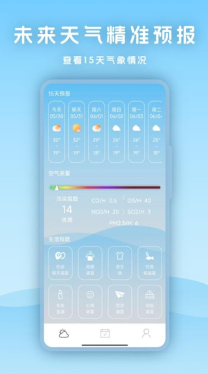 实时空气质量监测:认真呵护您的健康,实时更新空气质量、PM2.5等指数预报提供未来48小时及15天空气质量预报。