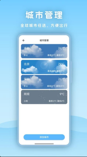 3、通过城市管理功能添加多个关注地区,快速切换查看不同城市的天气状况。