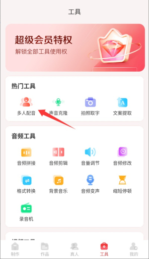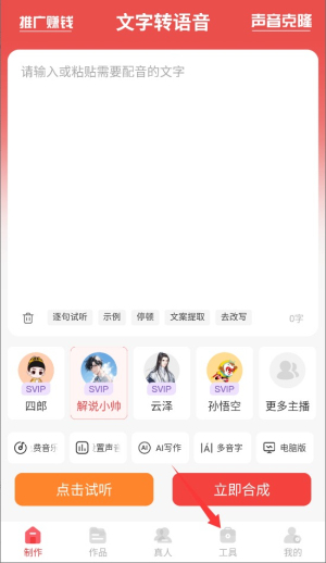 2、进入程序首页后,在功能导航区找到并点击"工具"选项,进入语音合成功能页面。