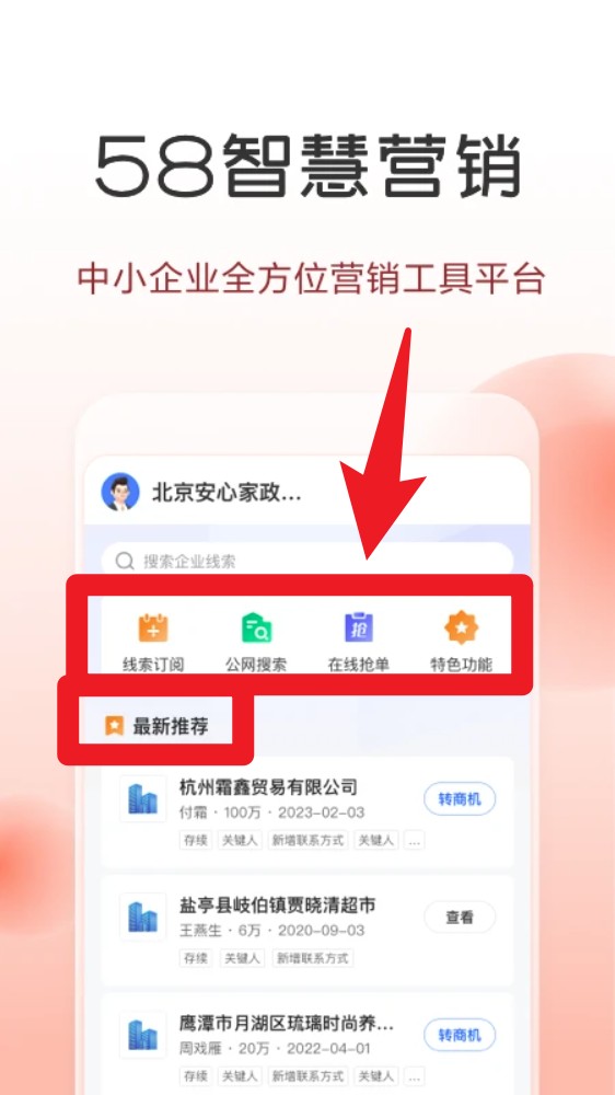 4. 若有商家需求,可进入“58智慧营销”区块,使用线索订阅、抢单工具、营销服务等功能。