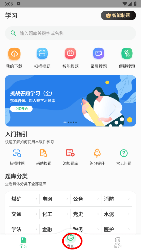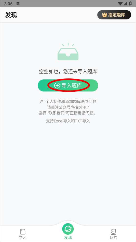 2、进入发现页面点击导入题库
