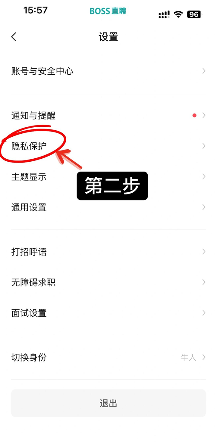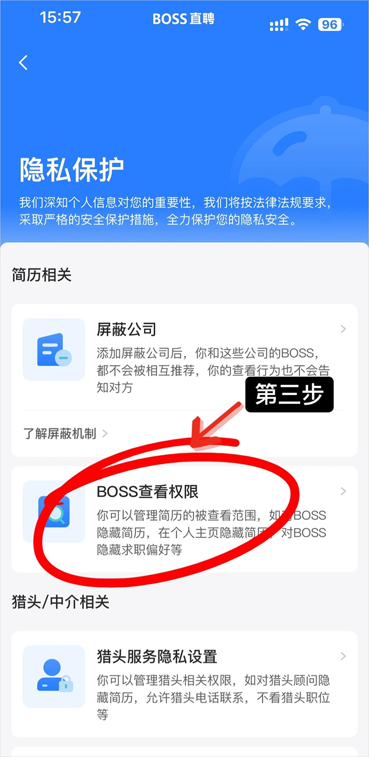 3、点击BOSS查看权限:在隐私保护页面中,点击BOSS查看权限。