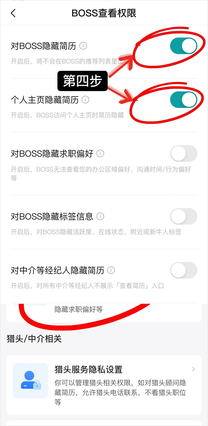 4、关闭求职状态:在BOSS查看权限页面,点击对BOSS隐藏简历,即可关闭求职状态。