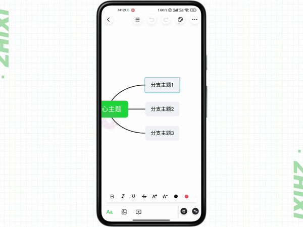 选中主题后,点击下方操作栏中的「文本编辑」按钮,可以对主题内的文本进行加粗、斜体、下划线、删除线、增大字号、减小字号、设置字体颜色等操作 。