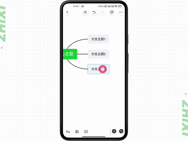 进入思维导图编辑界面,点击选中主题后,下方会弹出操作栏,分别有「文本编辑」、「插入图片」、「插入备注」、「新增同级主题」和「新增子主题」。