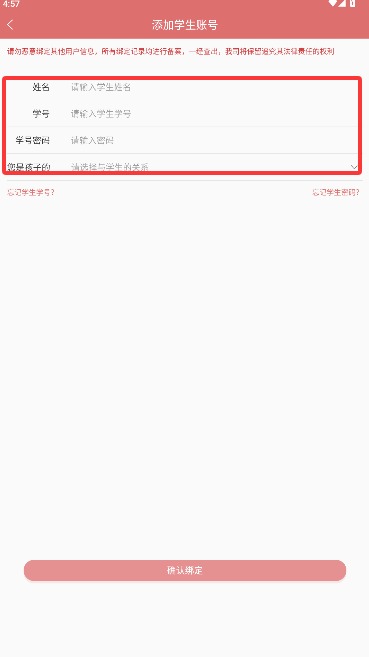 4、填写家长姓名、学生学号及对应密码,并选择亲子关系类型完成账户绑定流程。