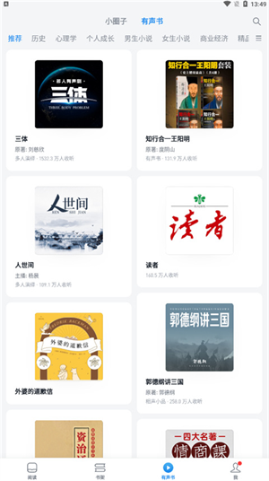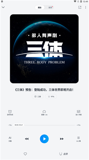 8、另外在有声书板块中,还有着现在热门的书籍进行有声阅读,如三体、人世间等,全部是免费,并且还支持设置定时关闭、语速、加入书架功能;