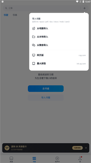 6、特别是导入书籍支持从电脑导入、从本地导入、从微信导入,并且支持txt、epud、pdf、doc、modi、azw3格式;