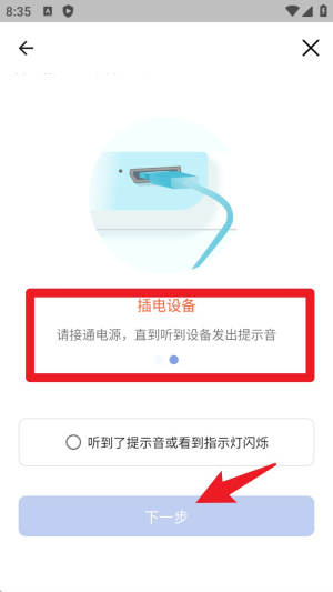 3. 根据提示插上摄像头电源,听到设备发出提示音或看到指示灯闪烁后点击“下一步”。