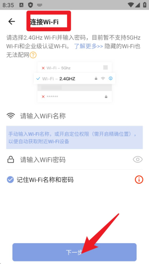 4. 输入 Wi-Fi 名称与密码,注意需连接 2.4GHz 网络,完成配置后继续下一步。