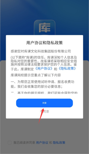 1、首次启动应用时,系统会显示用户协议和隐私政策,阅读后点击同意按钮进入主界面。