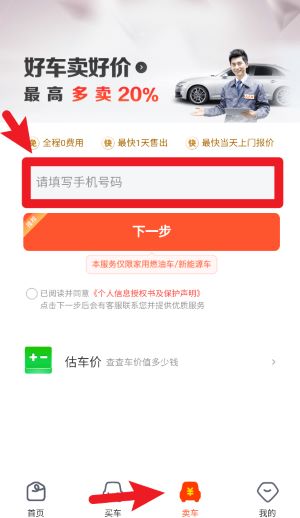 3、点击“卖车”进入后填写手机号并点击“下一步”,将由平台客服联系提供估价和后续服务。