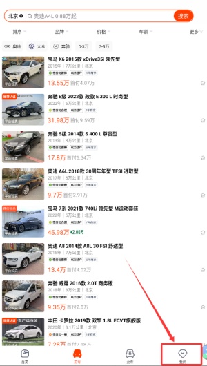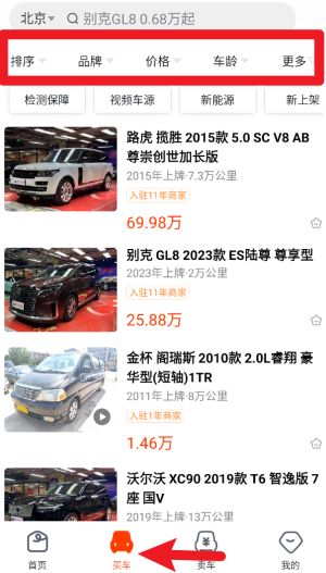 4、点击底部“买车”按钮进入列表页,可通过品牌、价格、车龄等筛选条件精准查找心仪车辆。