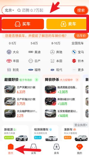2、切换“买车”与“卖车”模块可自由浏览不同服务内容,并支持按照价格、品牌等筛选条件。